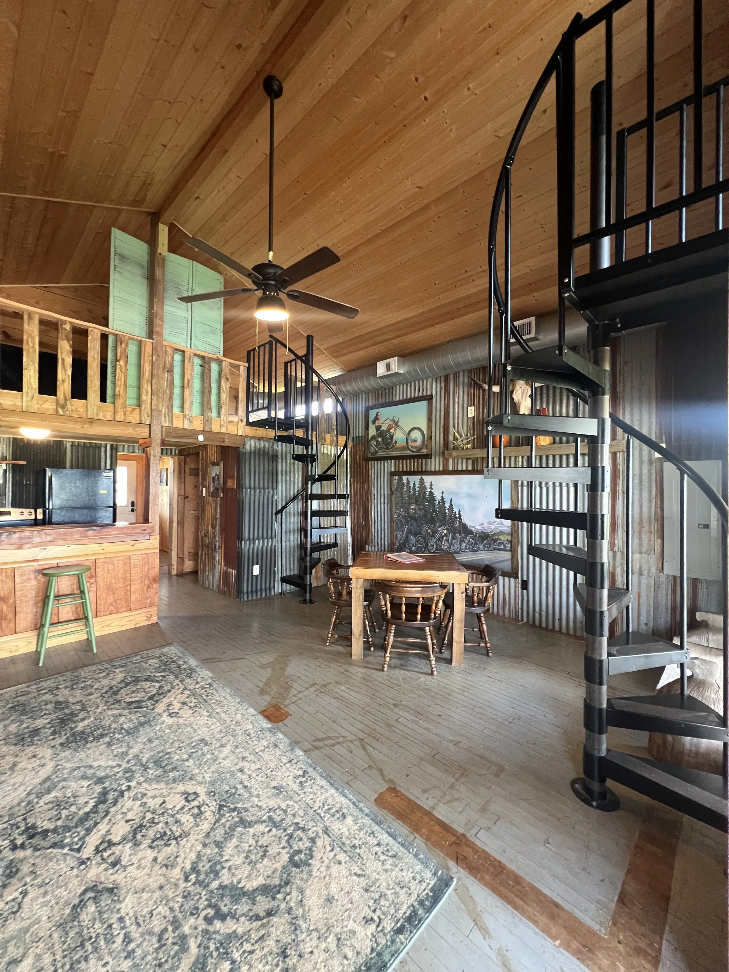Two bedrooms with full beds, bed loft with king bed, two full baths with showers, kitchen with bar and living area. Large private deck overlooks the canyon and stage.