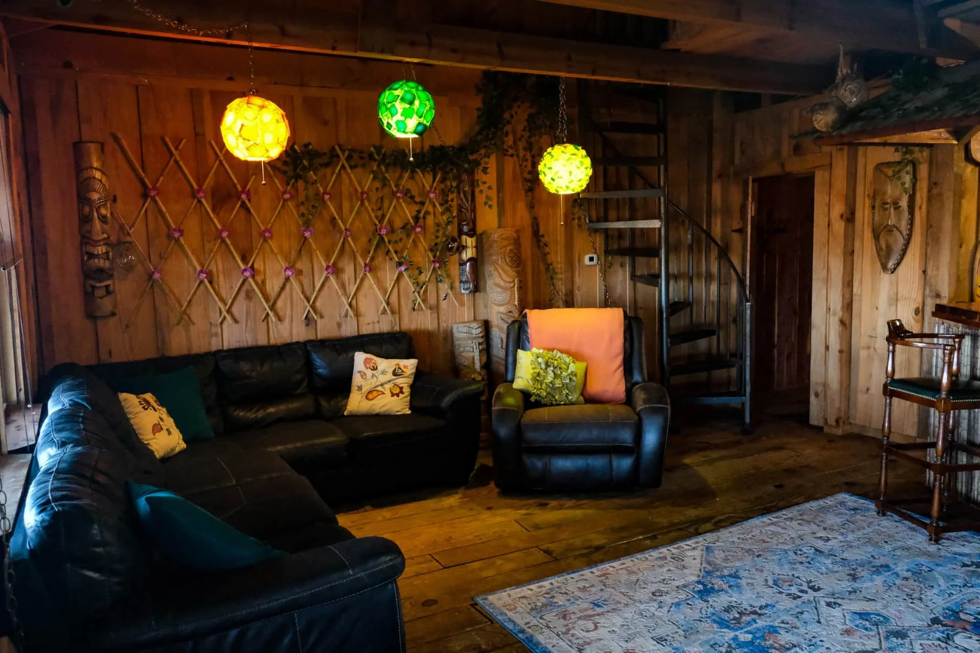 Funky Tiki vibe two bedrooms with queen/full beds, upstairs bunk loft for kids, 1.5 baths, kitchen with bar and living area. Large private deck overlooking the canyon and stage.