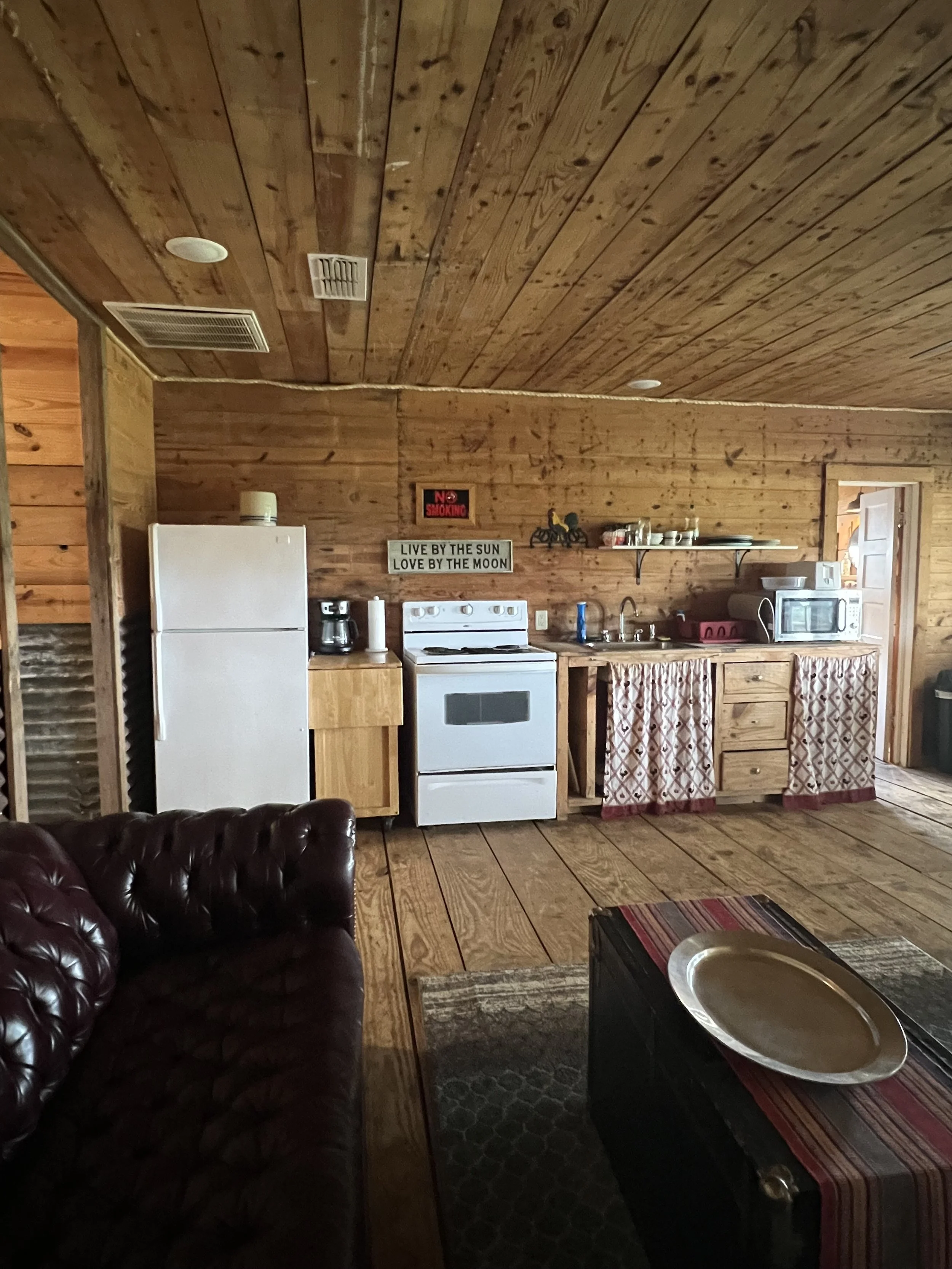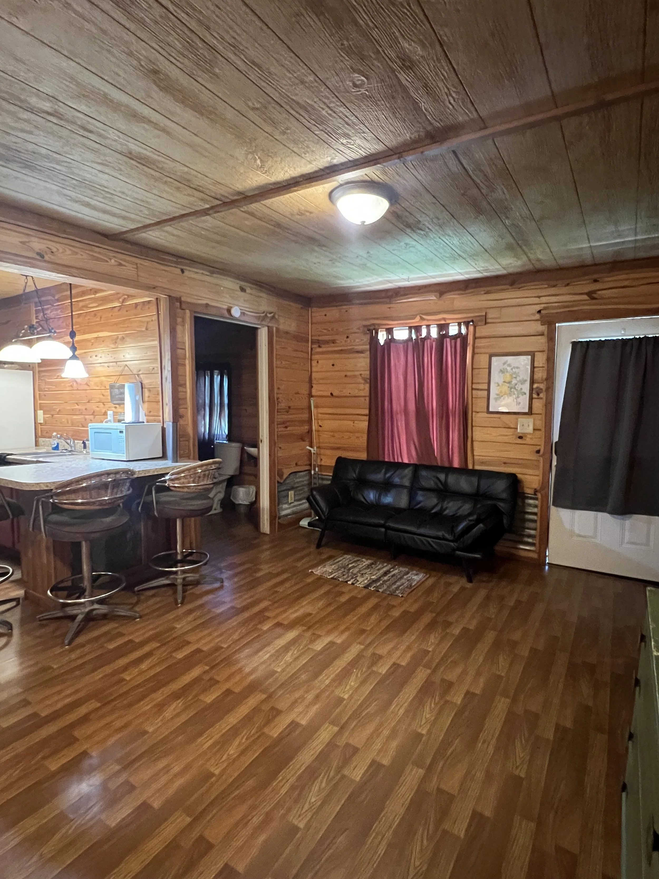 Suite style rustic cabin with two full beds, one bath with shower, kitchen with bar and living area. Front porch faces the canyon and stage.